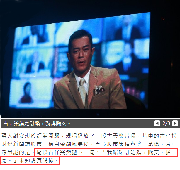 据香港媒体报道,谢安琪与今晚在香港红馆开个人演唱会,曾与其有过合作的好友古天乐也是以一个特殊的方式现身了演唱会,在演唱会现场播放了一段古天乐的片段,片中古天乐化身一个财经主播讲解股市,然而在片子的结尾,古天乐竟然突然来了一句“我刚刚订完婚,晚安,播完”。