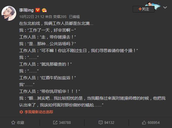 10月22日晚,荧屏上高冷的李现在个人社交网络平台上说起来段子,他写道“在东北拍戏,我俩工作人员都是东北滴…”,他说拍戏一天很辛苦,两位东北工作人员就热心地要请他去公众浴场搓澡,“就洗那最贵的”“带你洗尽铅华”,没想到这位当红偶像明星现在的顾虑是怕被搓澡师傅当场认出来。李现写得生动,网友跟帖也很风趣,有网友调侃“用手把师傅眼睛蒙上,让师傅搓”。