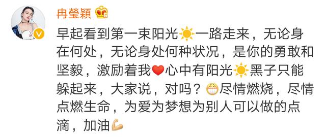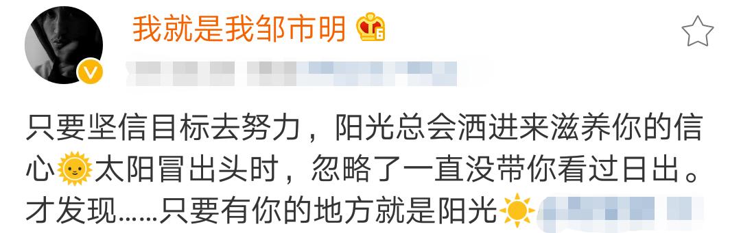 邹市明通过社交平台写到:“只要坚信目标去努力,阳光总会洒进来滋养你的信心,太阳冒出头时,忽略了一直没带你看过日出。才发现……只要有你的地方就是阳光”,与此同时他还圈中了娇妻的社交账号。随即,冉莹颖也留言互动到:“早起看到第一束阳光,一路走来,无论身在何处,无论身处何种状况,是你的勇敢和坚毅,激励着我,心中有阳光,黑子只能躲起来,大家说,对吗?尽情燃烧,尽情点燃生命,为爱为梦想为别人可以做的点滴,加油”。
